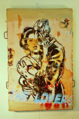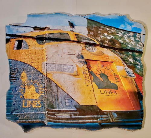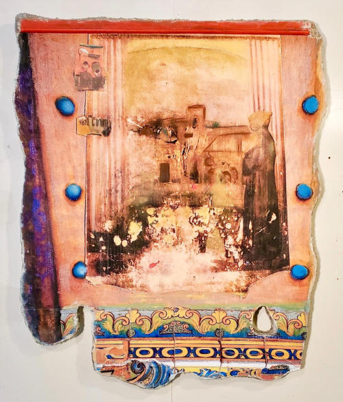 which include primarily archival color photograph with the following media applied which includes paint, collage,spray,