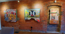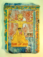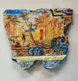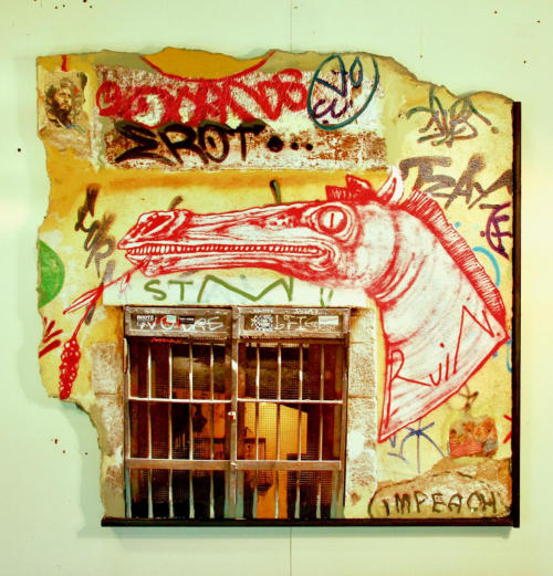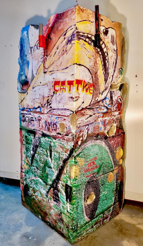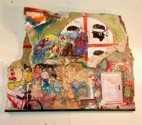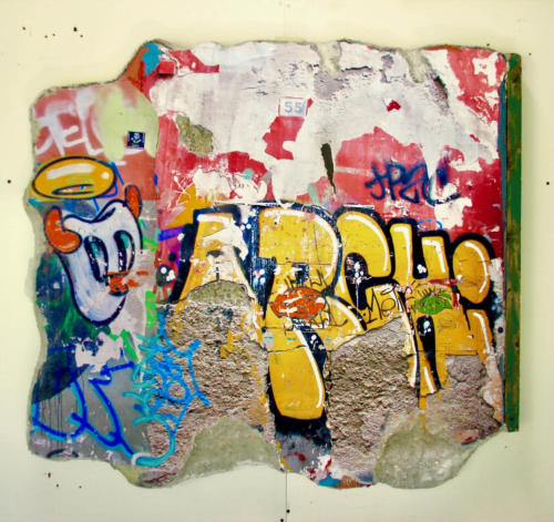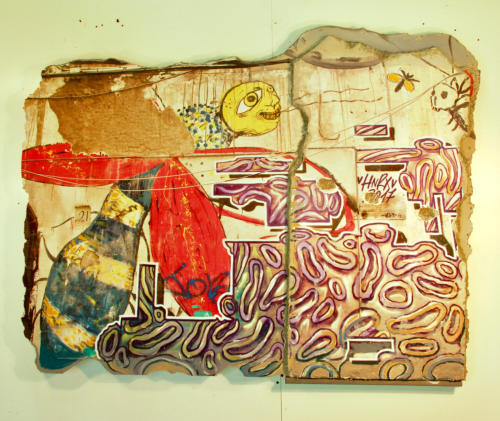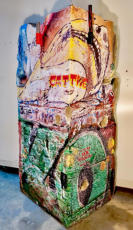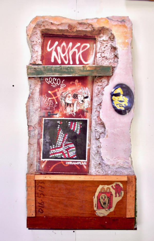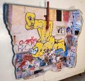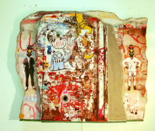 found objects, faux cement and all mounted on large slabs of Polystyrene or Styrofoam. Their scale range from a few